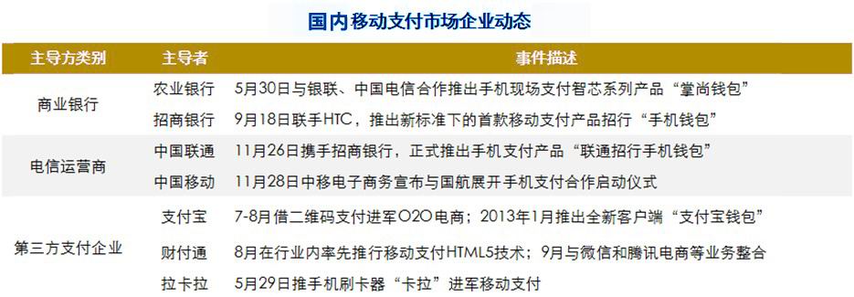 2011年6月,央行下發(fā)第三方支付牌照,銀聯(lián)、支付寶、銀聯(lián)商務(wù)、財(cái)付通、快錢等獲得許可證。三大運(yùn)營商紛紛成立了移動(dòng)支付公司。