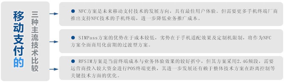 移動(dòng)支付功能大致可分為:移動(dòng)銀行、移動(dòng)錢包、非接觸式手機(jī)支付和手機(jī)支付終端化解決方案。移動(dòng)支付技術(shù)實(shí)現(xiàn)方案(主要指現(xiàn)場支付方案)主要包括NFC/eNFC方案、雙界面SIMPass方案、2.4G RFSIM方案、SIM卡表面貼膜卡方案、異形卡或貼片卡方案、雙界面SD卡方案等。目前較為主流的技術(shù)是中國電信采用的SIMPass,中國聯(lián)通的NFC,以及中國移動(dòng)的RFSIM和NFC三大主流技術(shù)。