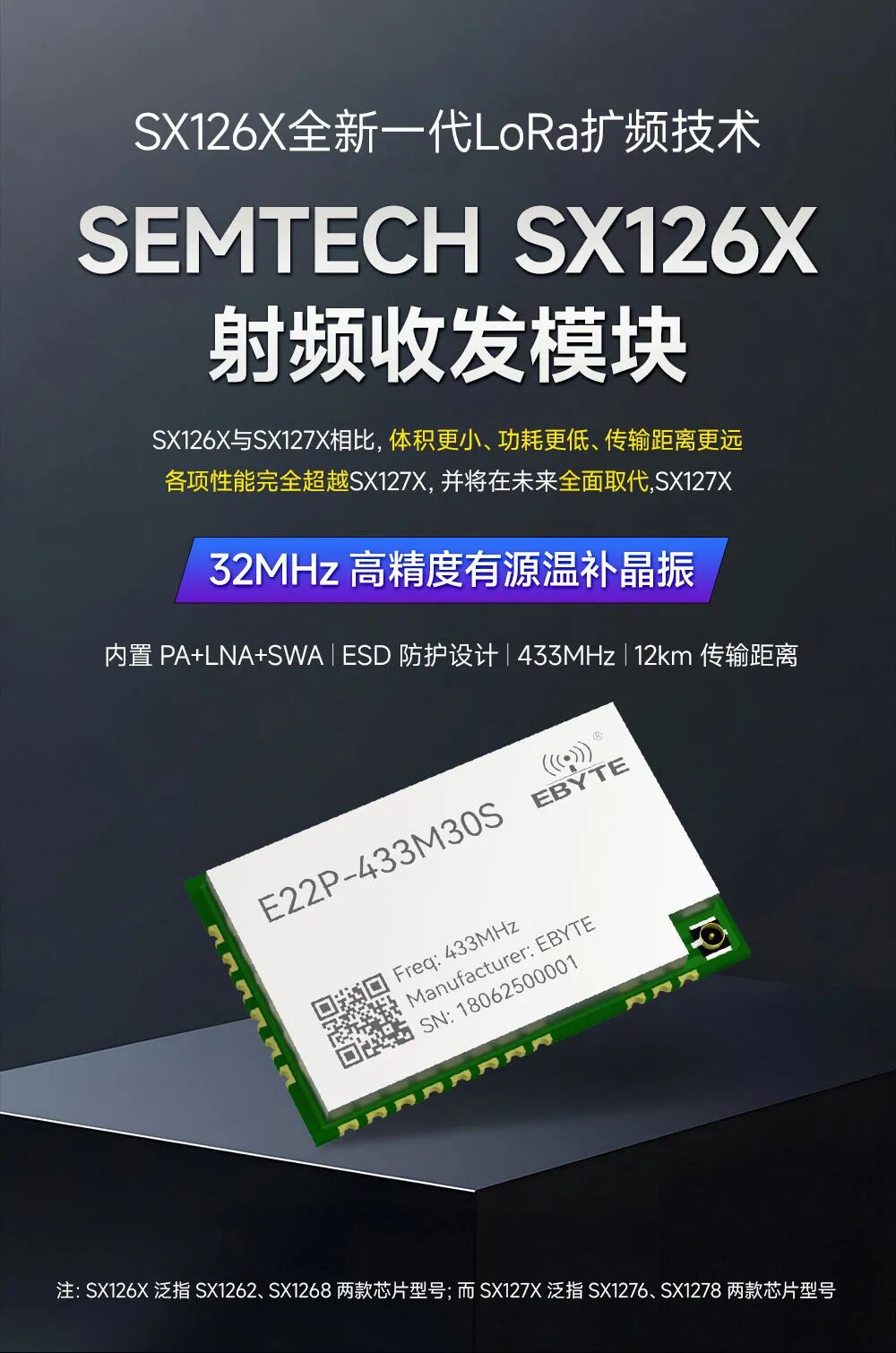 產(chǎn)品簡(jiǎn)介:E22P-433M30S系列模塊是基于Semtech高性能射頻芯片SX126X為核心自主研發(fā)的貼片式LoRa無(wú)線模塊,內(nèi)部使用工業(yè)級(jí)高精度有源溫補(bǔ)晶振。在原有基礎(chǔ)上增加射頻前端模組(RF FEM),該模組包含功率放大器(PA)、低噪聲放大器(LNA)和射頻開(kāi)關(guān),抗干擾性能與通信距離得到了提升,進(jìn)一步拉開(kāi)了與FSK、GFSK調(diào)制方式的產(chǎn)品的差距。