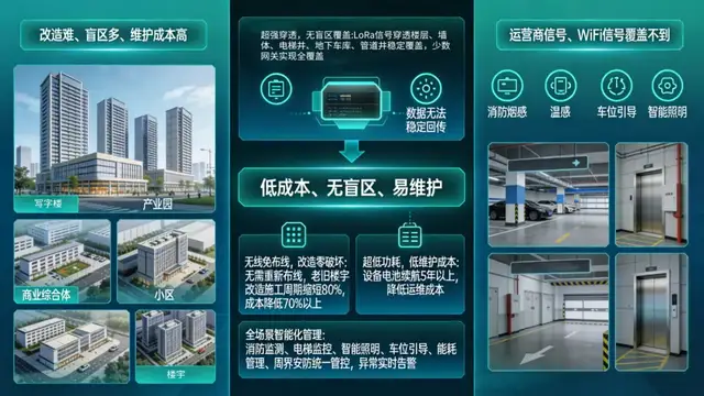 地下車庫、電梯井、管道井、消防通道等區(qū)域,運營商信號、WiFi 信號基本覆蓋不到,消防煙感、溫感、電梯狀態(tài)監(jiān)測、車位引導、智能照明等設備,數據無法穩(wěn)定回傳;老舊樓宇改造,重新布線成本高、難度大,設備維護頻繁,物業(yè)運營成本居高不下。