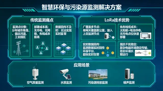 六、智慧環(huán)保與污染源監(jiān)測:全域實時監(jiān)管,解決 “監(jiān)測點分散、部署成本高、數據回傳不及時” 痛點