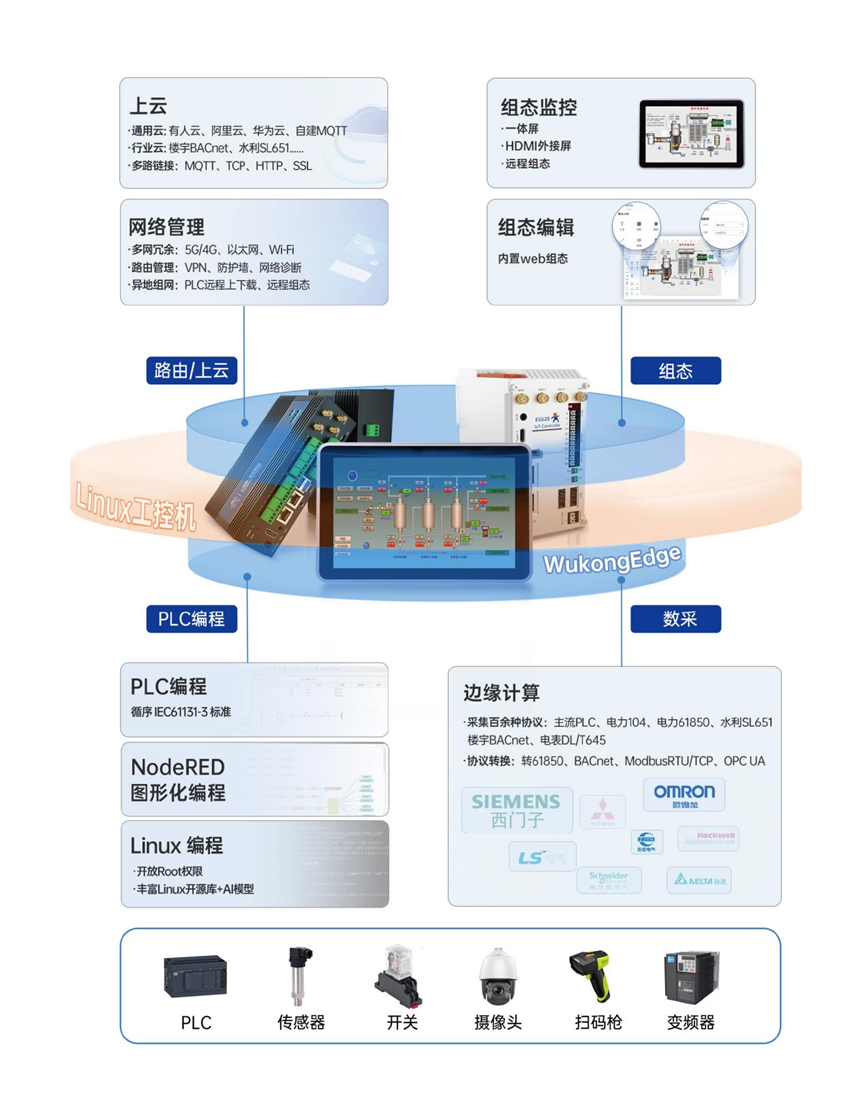 ARM工控機(jī)內(nèi)置邊緣物控軟件WukongEdge,集成數(shù)采、PLC、組態(tài)、路由能力,作為物聯(lián)網(wǎng)系統(tǒng)的控制中樞。